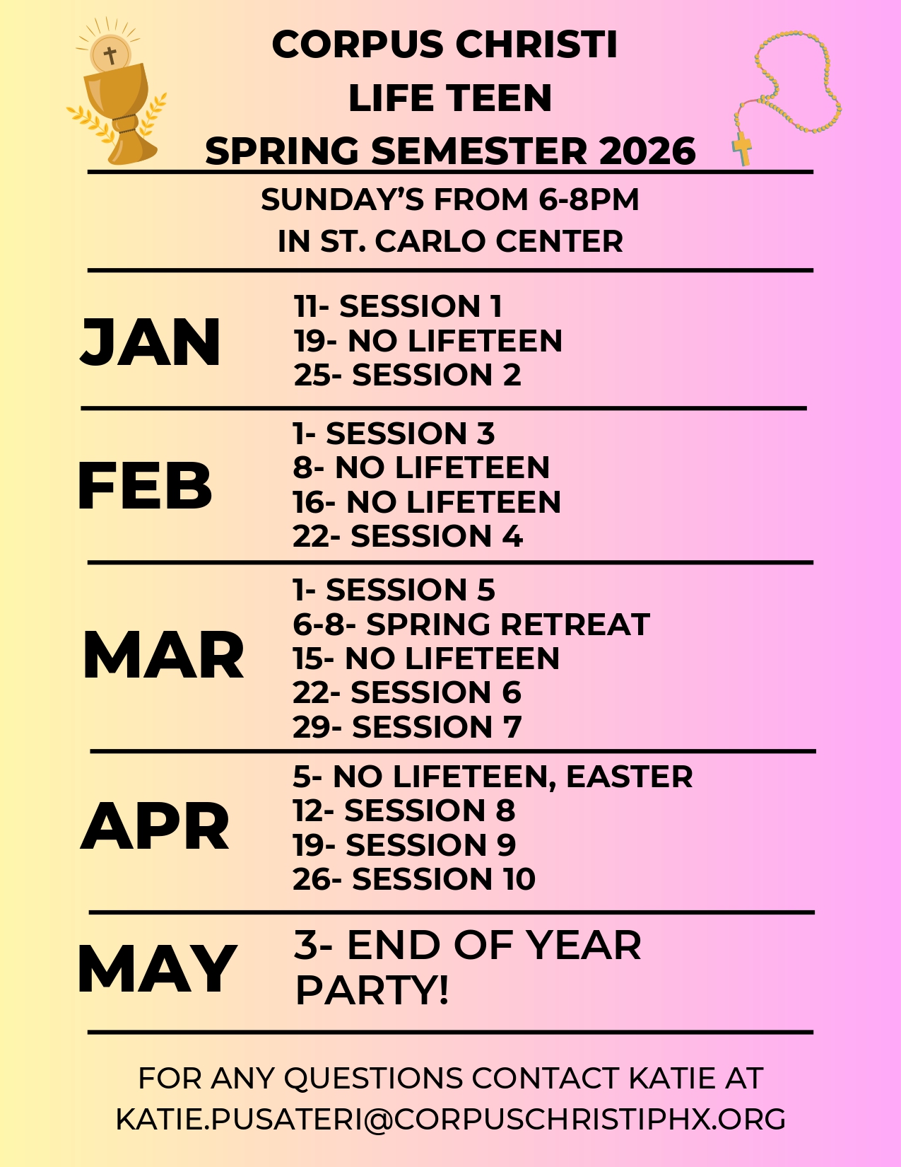 Join us every Sunday evening in the Saint Carlo Center (rooms 7, 8, and 9) from 6:15-8:00pm. Corpus Christi's Life Teen program focuses heavily on deep relationships with Christ and fellow teens through prayer and activities. We can't wait to meet you!