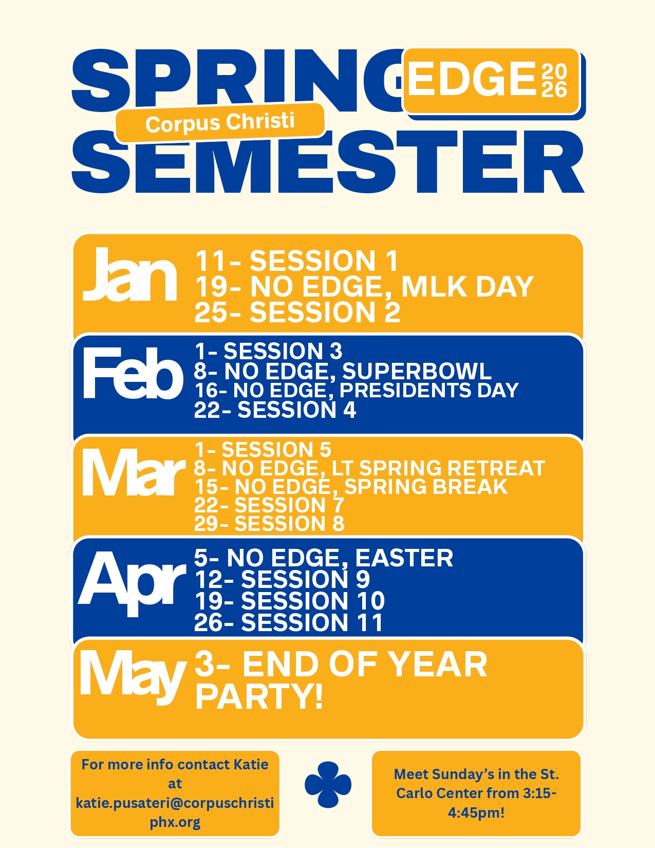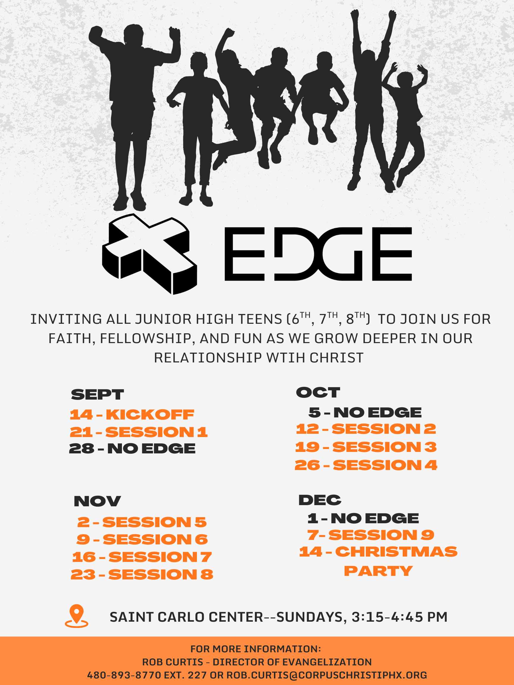 Join us every Sunday afternoon in the Saint Carlo Center from 3:15-4:45 PM! Corpus Christi's Edge program offers amazing opportunities to grow closer to Christ with the help of faithful friends and leaders. Each teen is taught how to grow a personal relationship with Christ through prayer, fellowship, and fun!